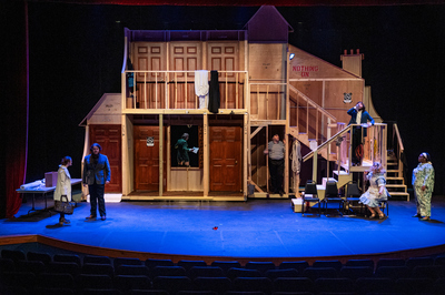 Performance photograph of Noises Off! by Michael Frayn, performed by A-State Theatre in November 2023.