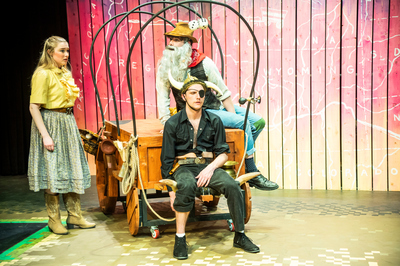 Performance photograph for The Trail to Oregon! performed by A-State Theatre in April 2023.