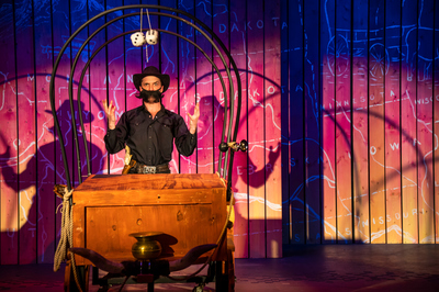 Performance photograph for The Trail to Oregon! performed by A-State Theatre in April 2023.