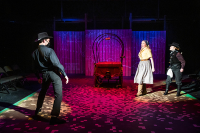 Performance photograph for The Trail to Oregon! performed by A-State Theatre in April 2023.