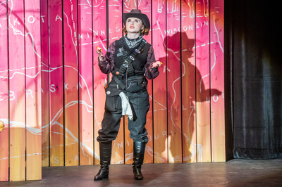Performance photograph for The Trail to Oregon! performed by A-State Theatre in April 2023.