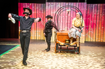 Performance photograph for The Trail to Oregon! performed by A-State Theatre in April 2023.