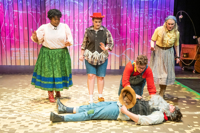 Performance photograph for The Trail to Oregon! performed by A-State Theatre in April 2023.