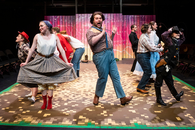 Performance photograph for The Trail to Oregon! performed by A-State Theatre in April 2023.