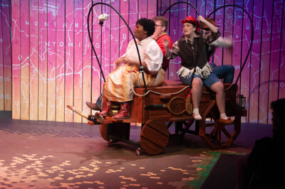 Performance photograph for The Trail to Oregon! performed by A-State Theatre in April 2023.