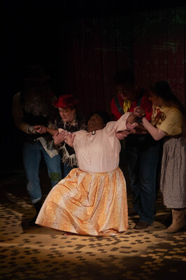 Performance photograph for The Trail to Oregon! performed by A-State Theatre in April 2023.