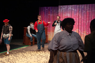 Performance photograph for The Trail to Oregon! performed by A-State Theatre in April 2023.