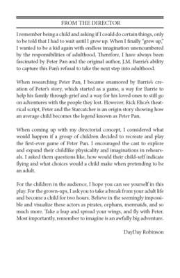 For the children in the audience, I hope you can see yourself in this play. For the grown-ups, I ask you to take a break from your adult life and become a child for two hours. Believe in the seemingly impossible and visualize these actors as pirates, orphans, mermaids, and so much more. Take a leap and spread your wings, and fly with Peter. Most importantly, remember to imagine is an awfully big adventure.