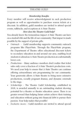 Membership Benefits Every member will receive acknowledgment in each production program as well as opportunities to purchase season tickets at a discount. In addition, guild members are invited to attend special events, talkbacks, and receptions at A-State Theatre.