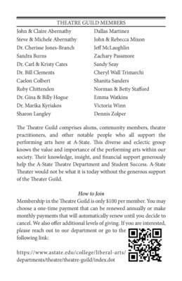 Membership in the Theatre Guild is only $100 per member. You may choose a one-time payment that can be renewed annually or make monthly payments that will automatically renew until you decide to cancel. We also offer additional levels of giving. If you are interested, please reach out to our department or go to the following link: