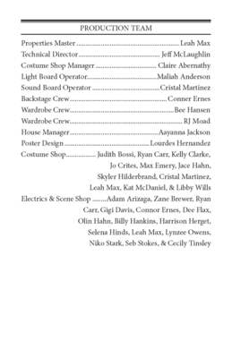 Electrics & Scene Shop - Adam Arizaga, Zane Brewer, Ryan Carr, Gigi Davis, Connor Ernes, Dee Flax, Olin Hahn, Billy Hankins, Harrison Herget, Selena Hinds, Leah Max, Lynzee Owens, Niko Stark, Seb Stokes, & Cecily Tinsley